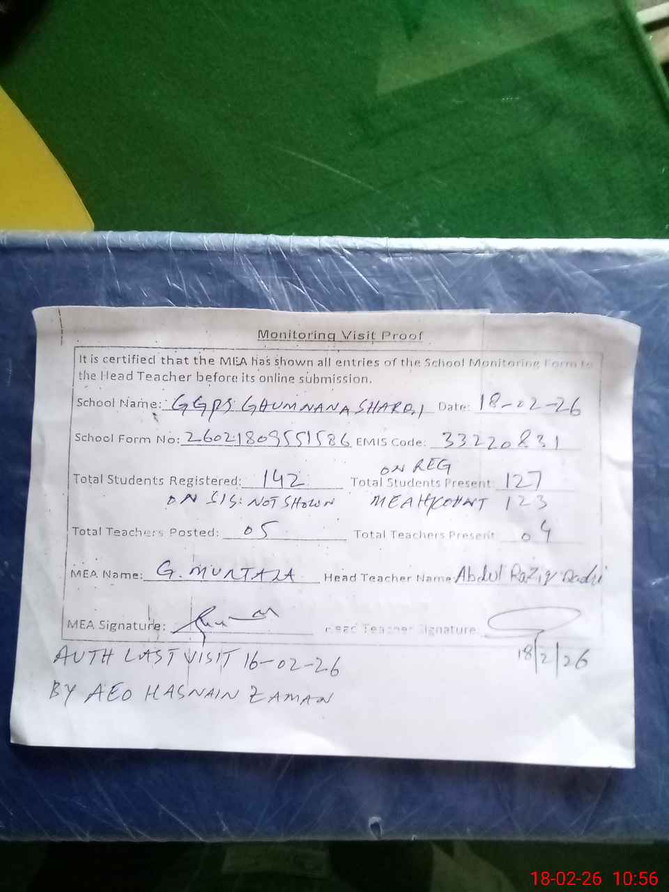 | Attendance Register | Head Teacher | MEA with School | Visit Proof |