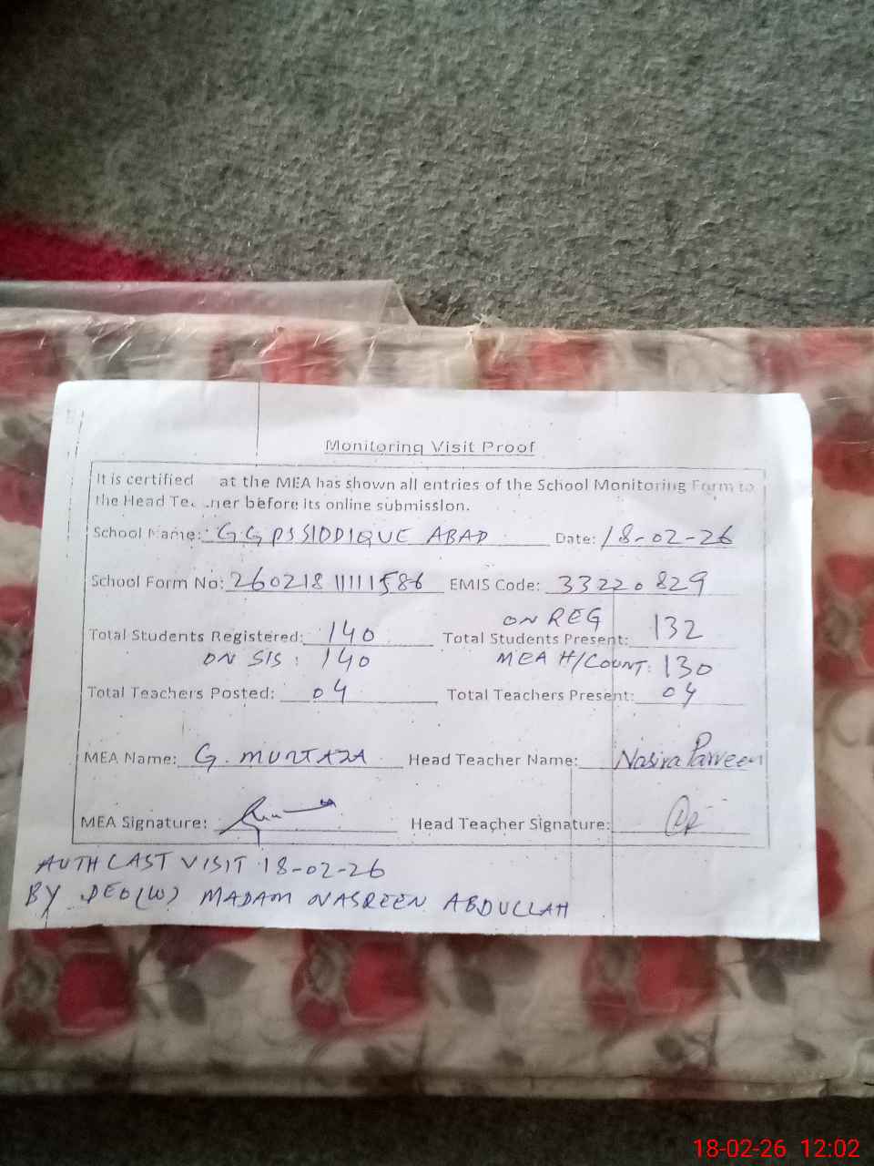 | EMIS Code: 33220829 | Name of School: GGPS SIDDIQUE ABAD | |||