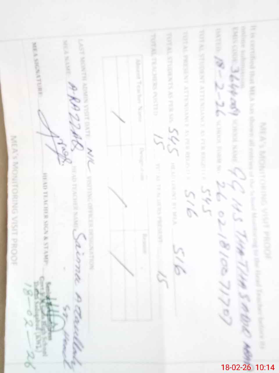 | Certified that this School was Inspected by the Undersigned MEA/DMO Today and the Information Stated Above is as Per Record. | |||||