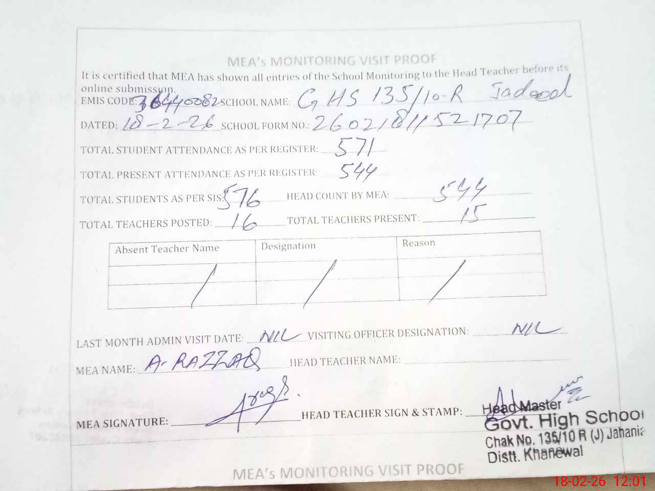| Attendance Register | Head Teacher | MEA with School | Visit Proof |