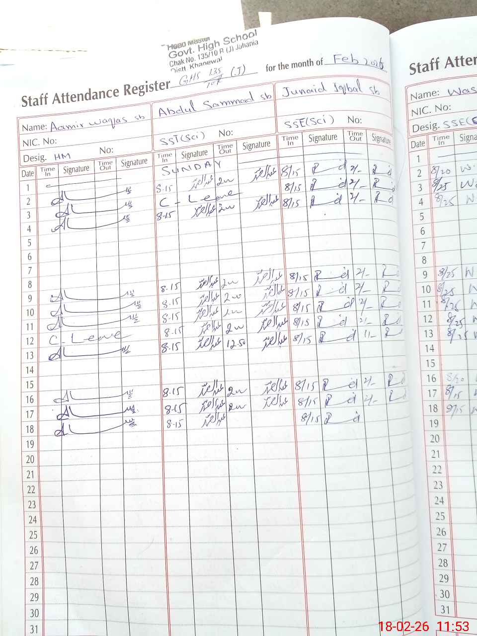 | CNIC | Full Name | Designation | R/C | Absence During Last Calender Month |