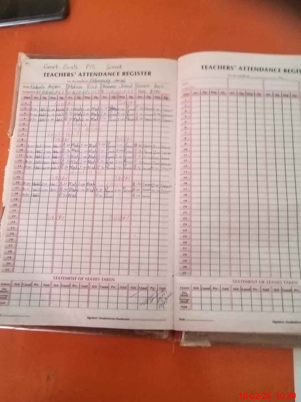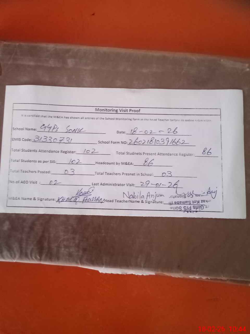 | Attendance Register | Head Teacher | MEA with School | Visit Proof |