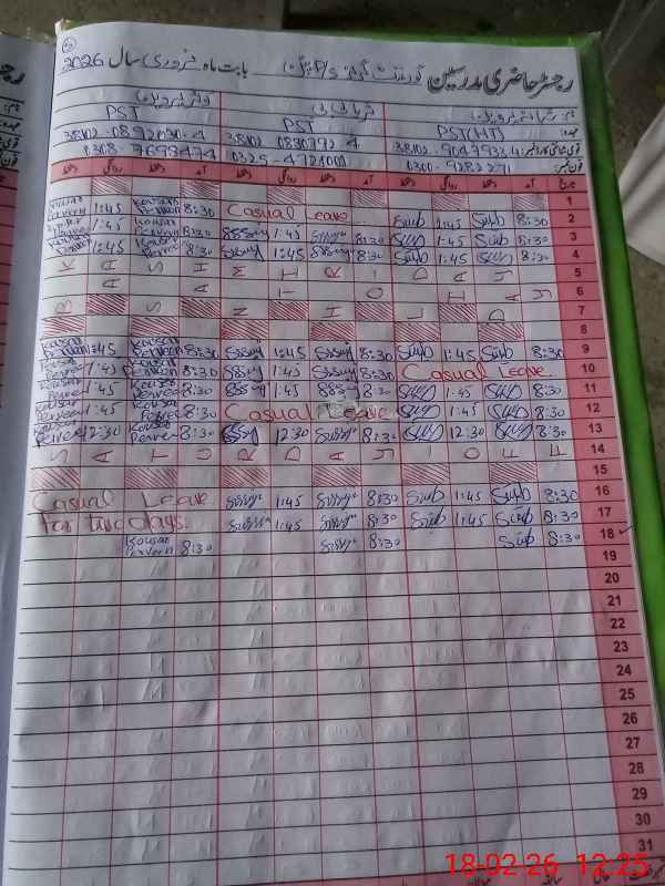 | CNIC | Full Name | Designation | R/C | Absence During Last Calender Month |