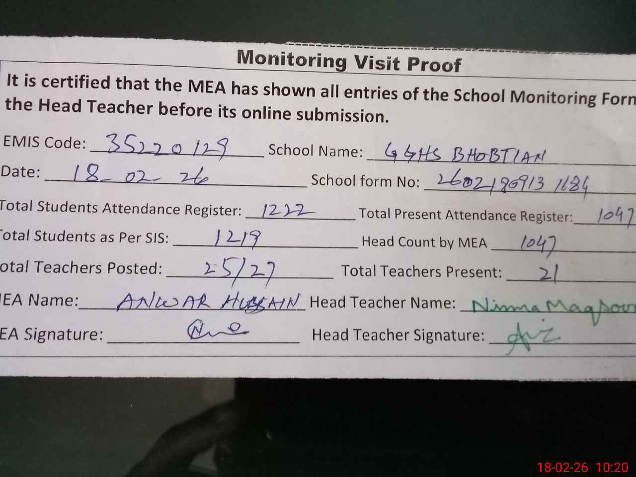 | Attendance Register | Head Teacher | MEA with School | Visit Proof |