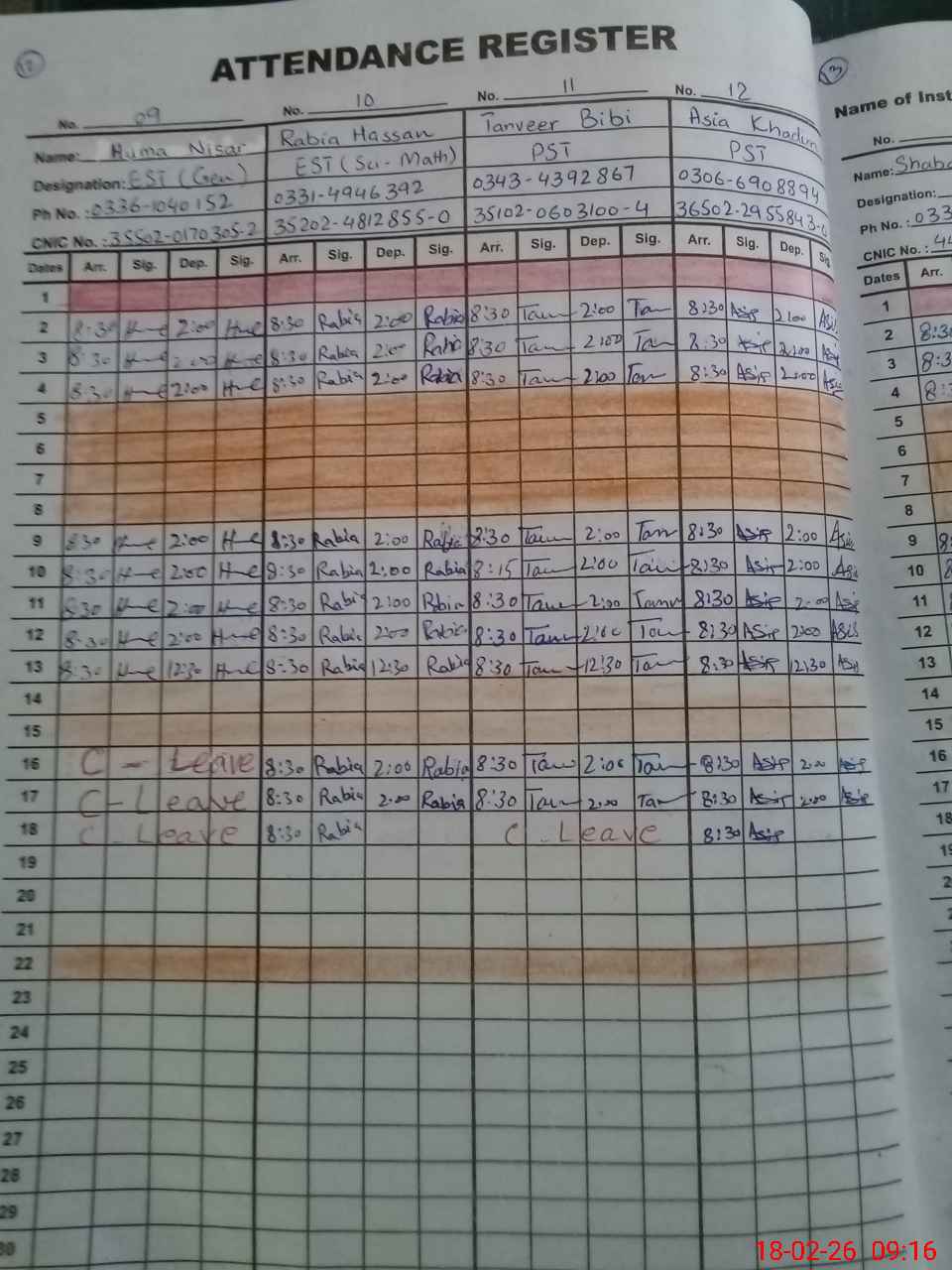 | CNIC | Full Name | Designation | R/C | Absence During Last Calender Month |