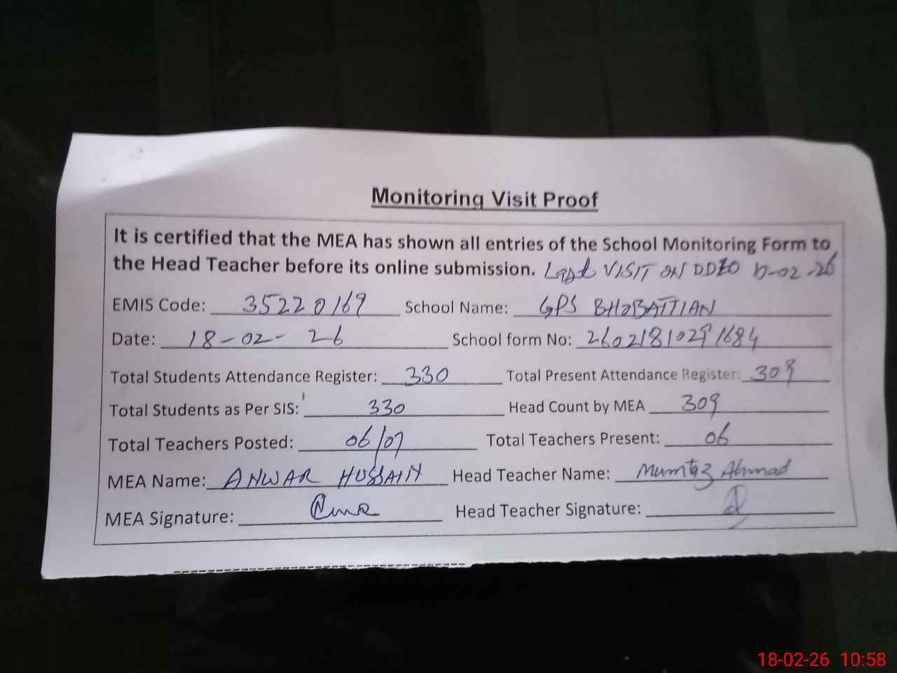 | Remarks (Use Separate Page if Required): Last visit DDEO on 10 February 2026 02 class Room under construction wef 2016 to till date work stop | |||||