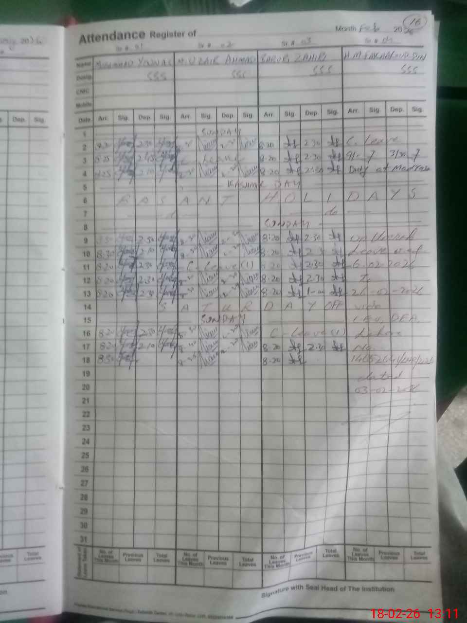 | Remarks (Use Separate Page if Required): Teacher Muhammad Shukial Anjum EST absent from duty since 26 January 2026 to till date | |||||