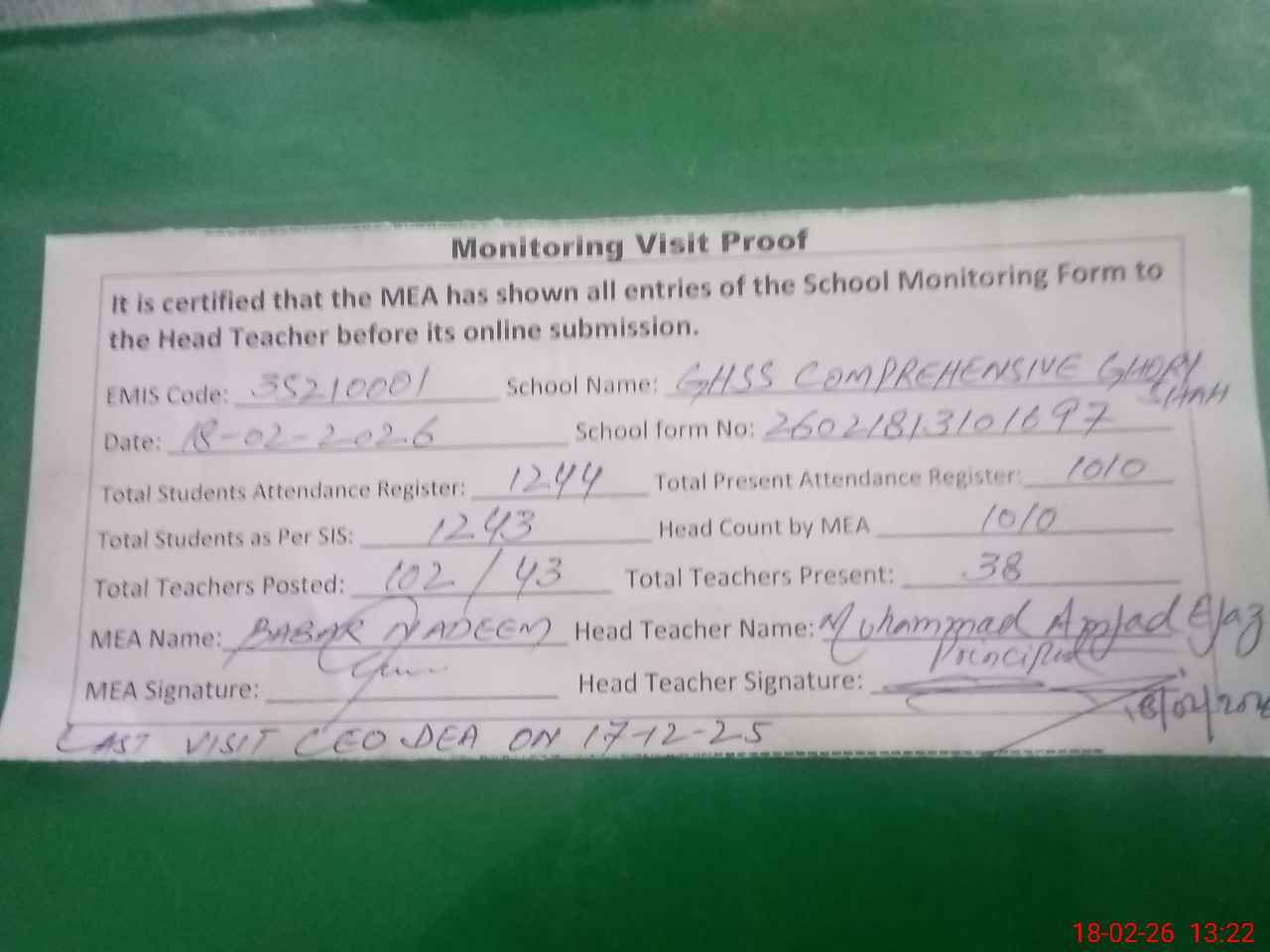 | EMIS Code: 35210001 | Name of School: GHSS COMPREHENSIVE GHORAY SHAH | |||
