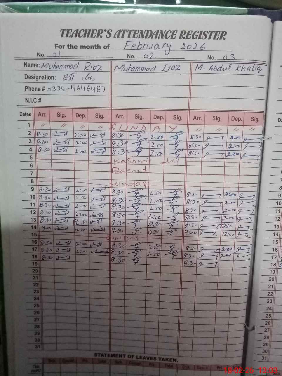 | Name: Mu**** RI**** Designation: (School Headmaster's/Headmistress's) EST (GENERAL) Phone/Cell Number: 03**** |