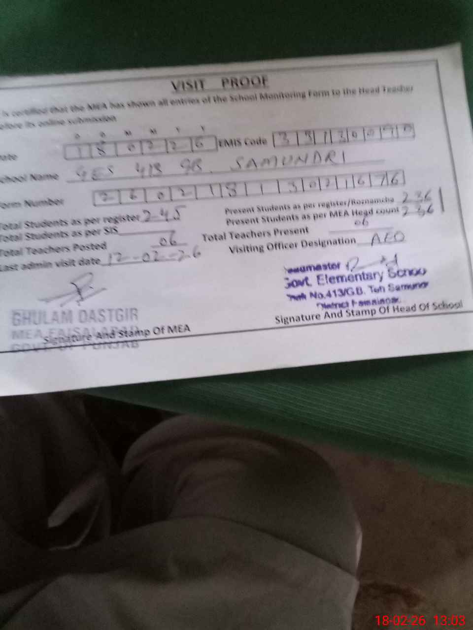 | Attendance Register | Head Teacher | MEA with School | Visit Proof |