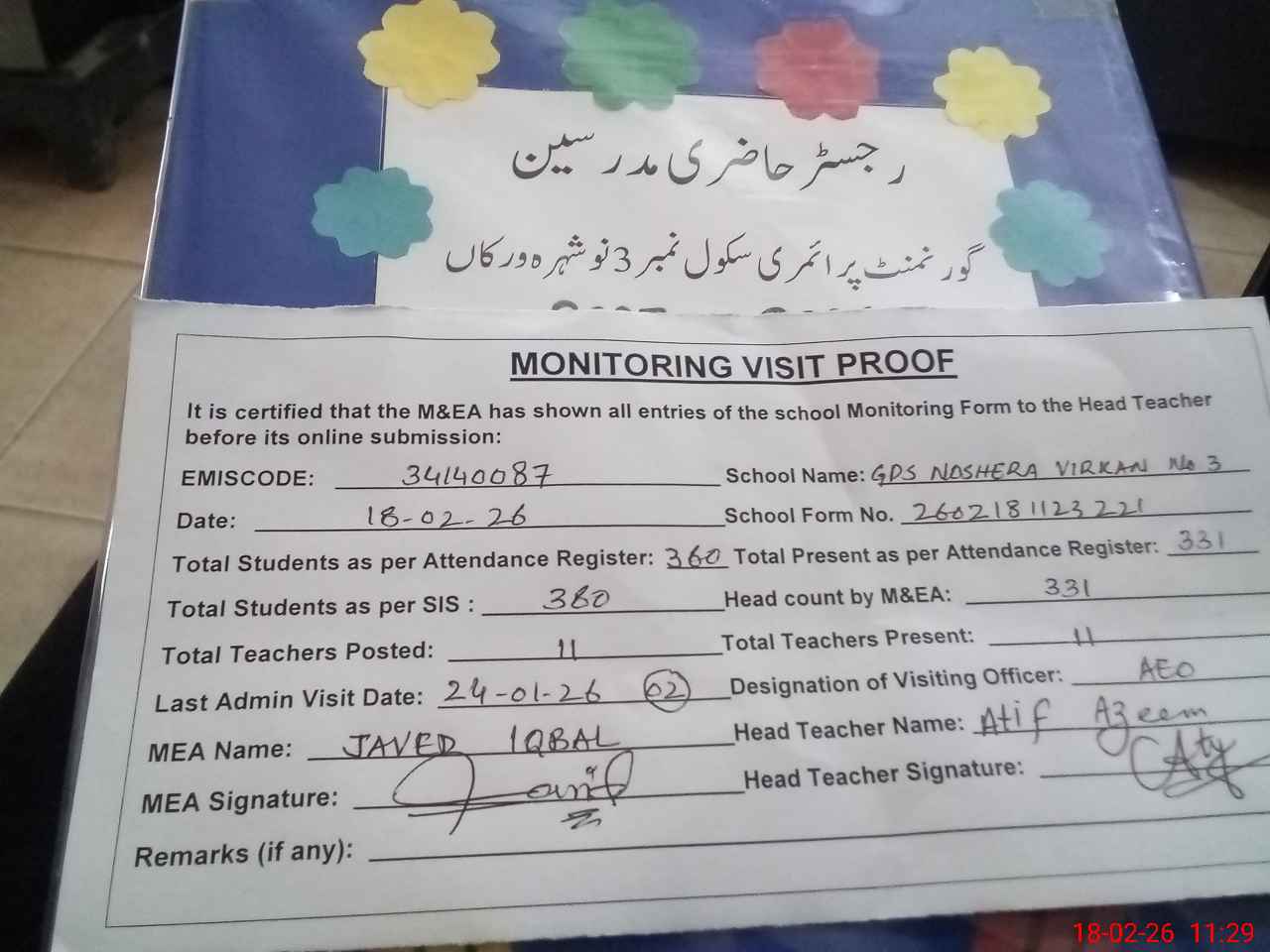 | EMIS Code: 34140087 | Name of School: GPS NOWSHERA VIRKAN NO.3 | |||