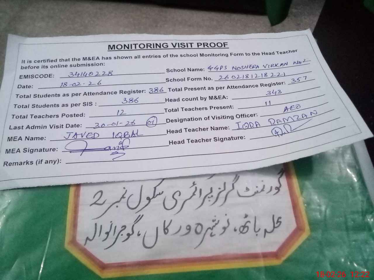 | Certified that this School was Inspected by the Undersigned MEA/DMO Today and the Information Stated Above is as Per Record. | |||||