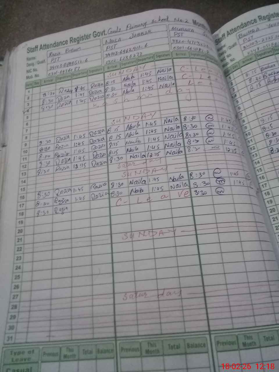| CNIC | Full Name | Designation | R/C | Absence During Last Calender Month |