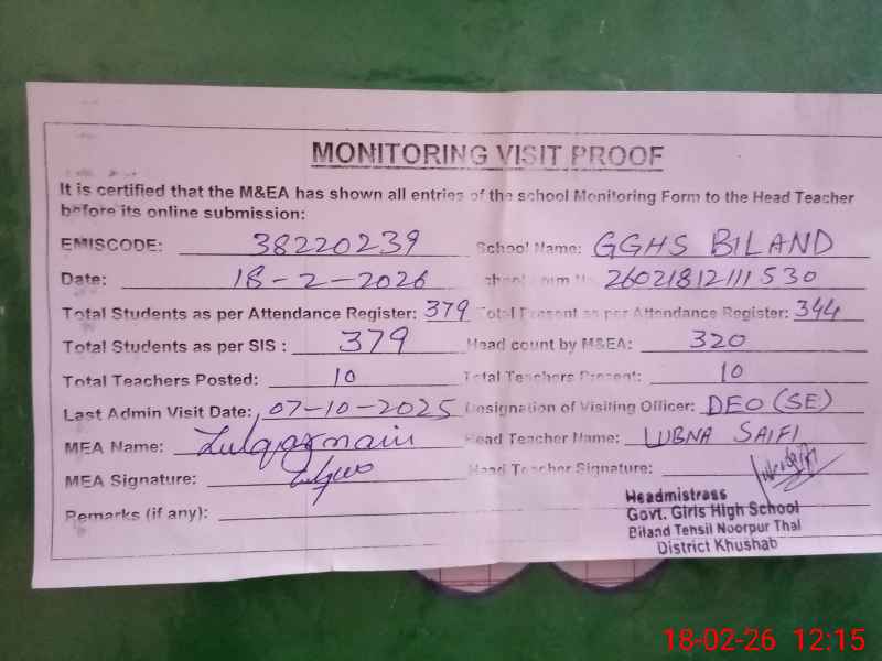 | Certified that this School was Inspected by the Undersigned MEA/DMO Today and the Information Stated Above is as Per Record. | |||||