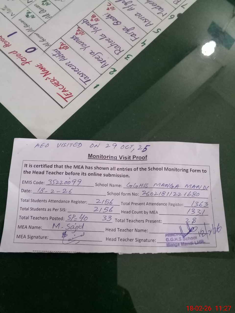 | Attendance Register | Head Teacher | MEA with School | Visit Proof |