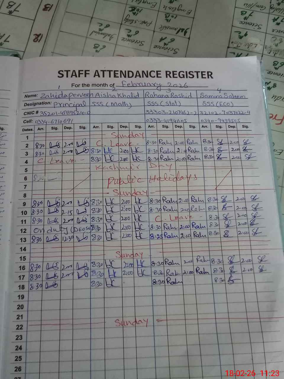 | CNIC | Full Name | Designation | R/C | Absence During Last Calender Month |