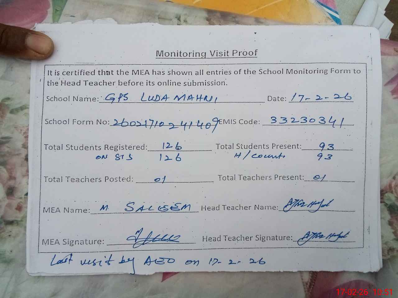 | Attendance Register | Head Teacher | MEA with School | Visit Proof |
