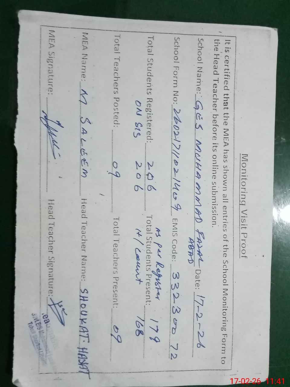 | EMIS Code: 33230072 | Name of School: GES MOHAMMAD FAZAL ABAD | |||