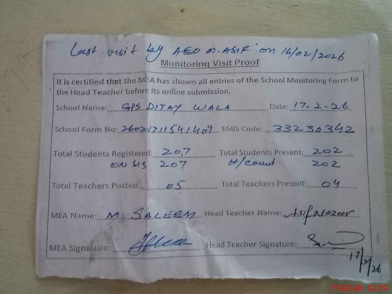 | EMIS Code: 33230342 | Name of School: GPS DITAY WALA | |||