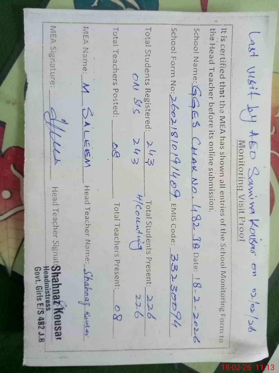 | EMIS Code: 33230094 | Name of School: GGES CHAK NO 482 JB | |||