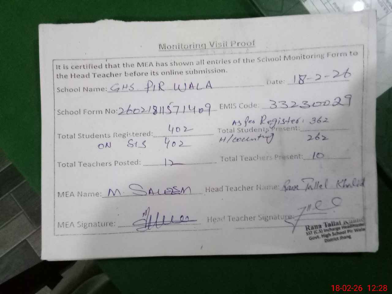 | EMIS Code: 33230029 | Name of School: GHS PIR WALA | |||