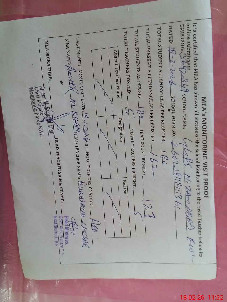 | Attendance Register | Head Teacher | MEA with School | Visit Proof |
