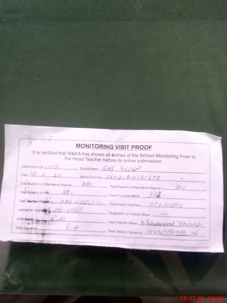 | Attendance Register | Head Teacher | MEA with School | Visit Proof |