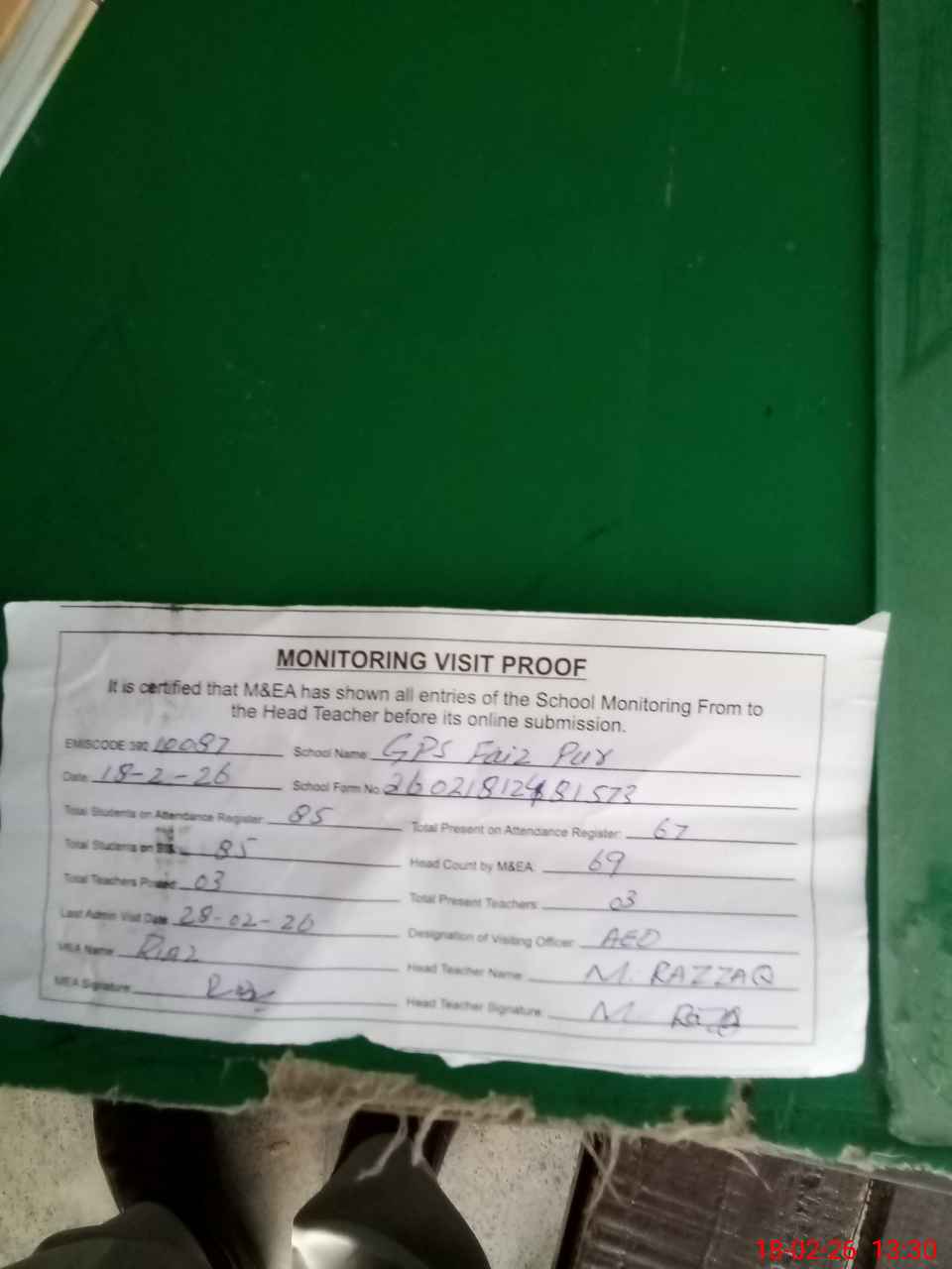 | Attendance Register | Head Teacher | MEA with School | Visit Proof |