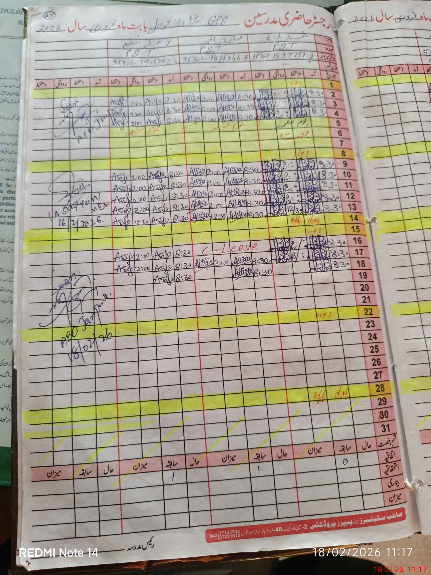| CNIC | Full Name | Designation | R/C | Absence During Last Calender Month |