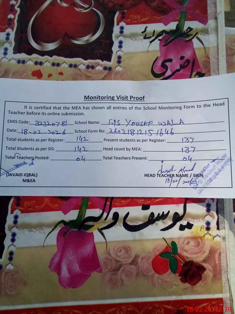 | Attendance Register | Head Teacher | MEA with School | Visit Proof |