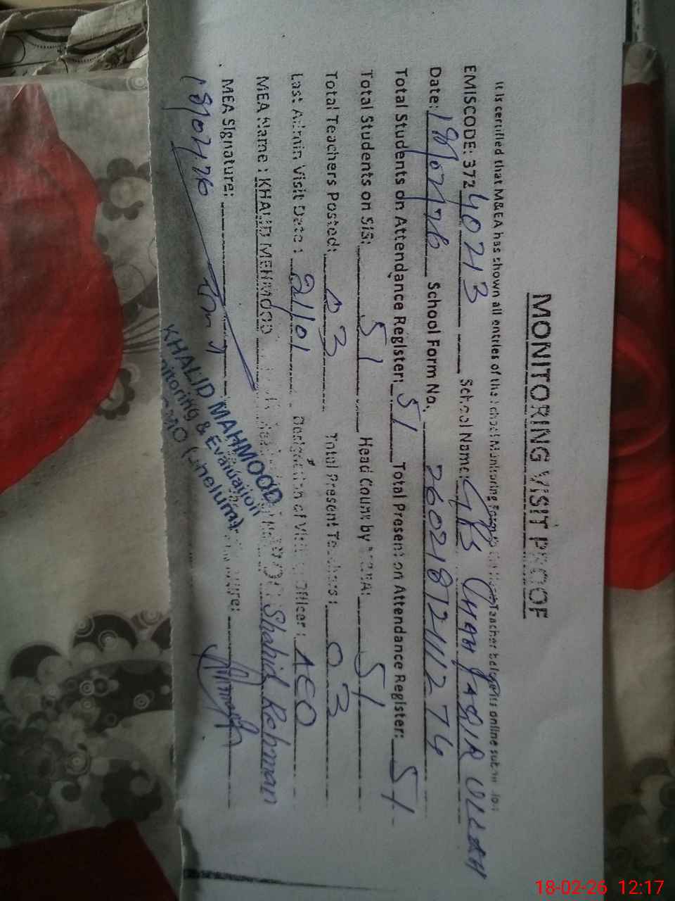 | Attendance Register | Head Teacher | MEA with School | Visit Proof |