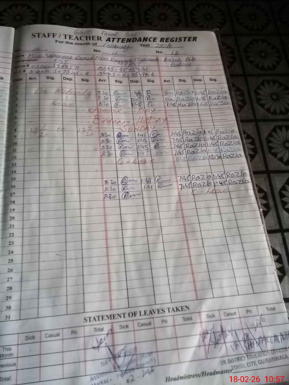 | Name: Sa**** Ha**** Designation: (School Headmaster's/Headmistress's) PST Phone/Cell Number: 03**** |
