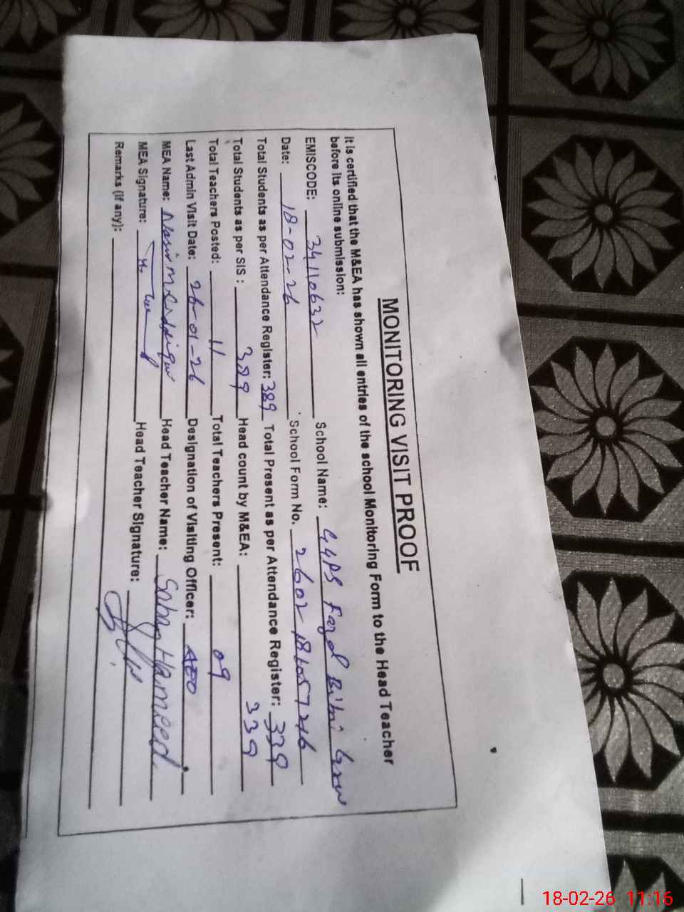 | Attendance Register | Head Teacher | MEA with School | Visit Proof |
