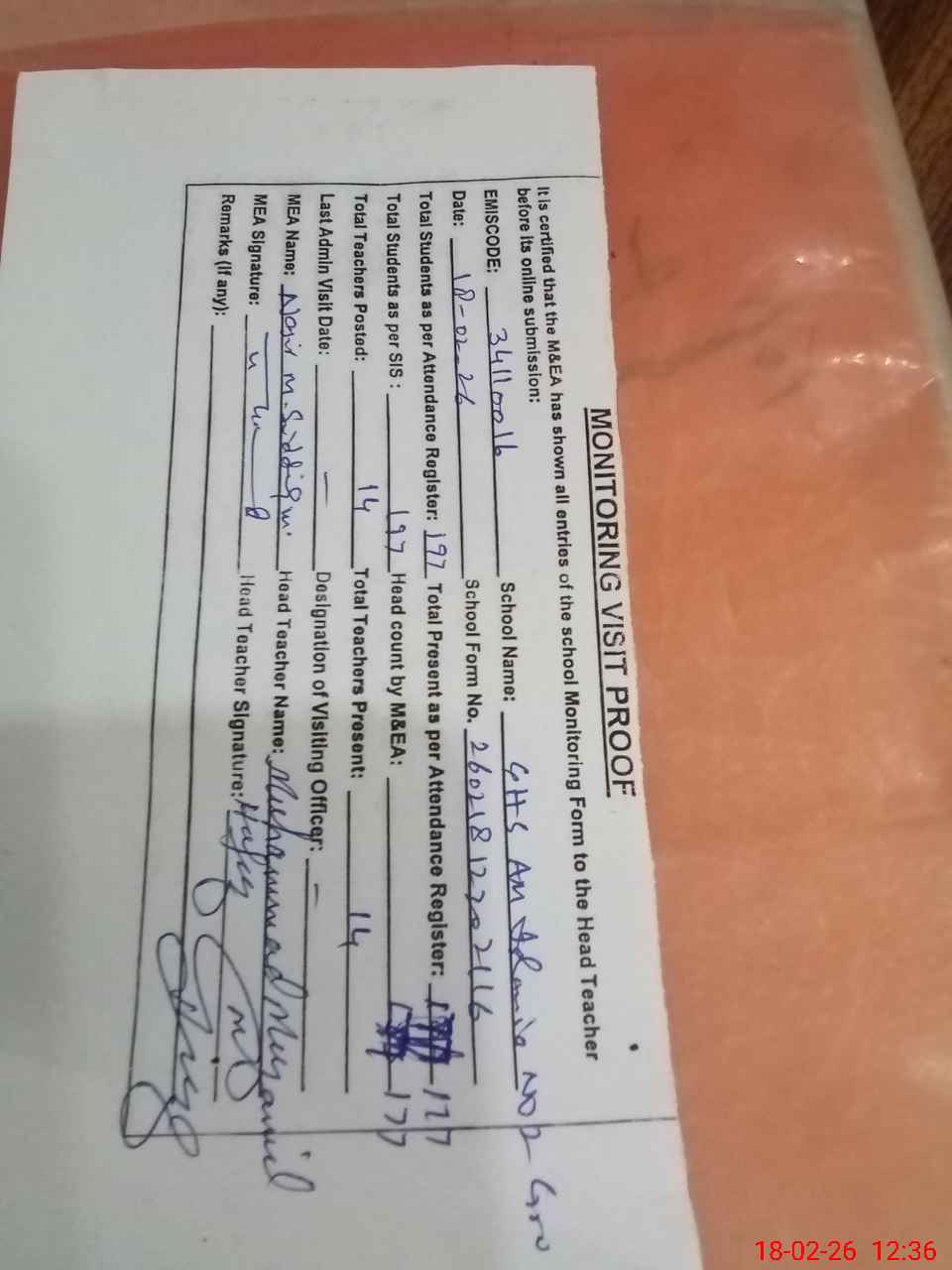 | Attendance Register | Head Teacher | MEA with School | Visit Proof |