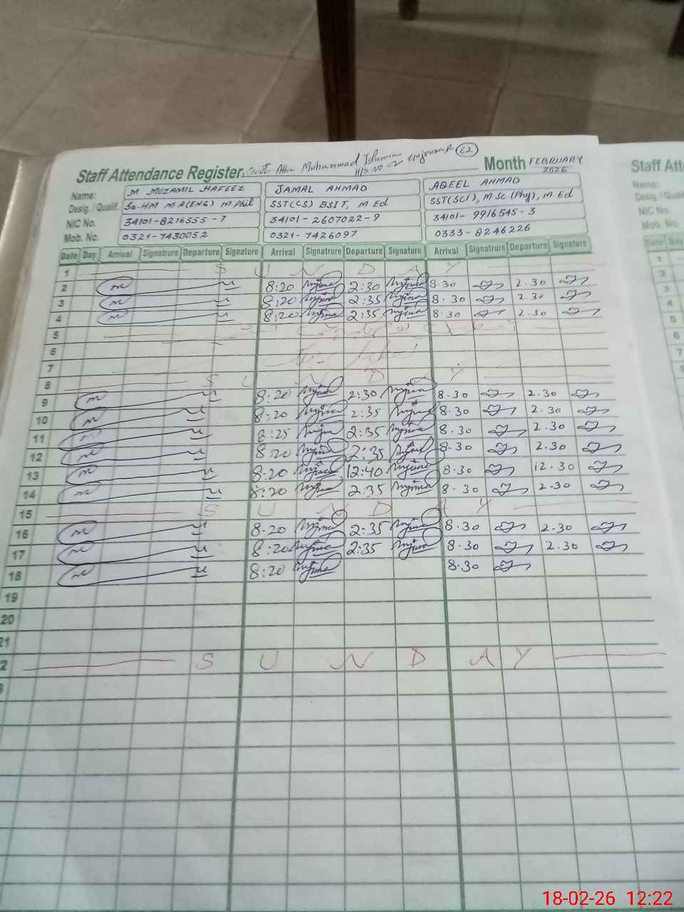 | CNIC | Full Name | Designation | R/C | Absence during last cal. month |