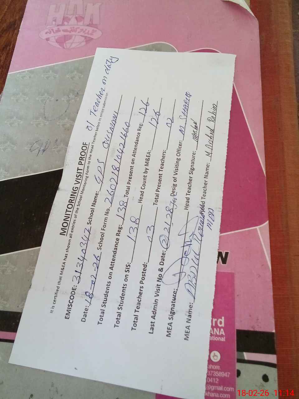 | Attendance Register | Head Teacher | MEA with School | Visit Proof |