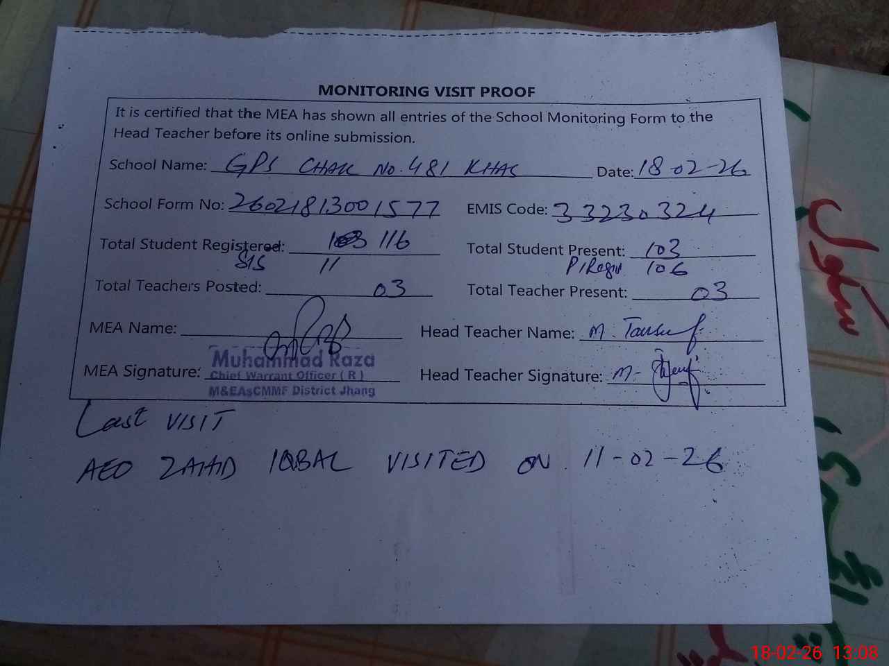 | Attendance Register | Head Teacher | MEA with School | Visit Proof |