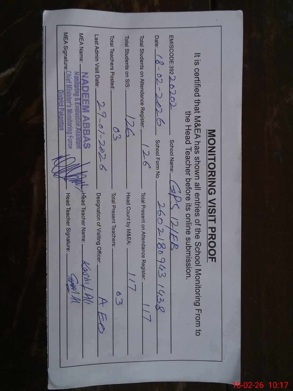 | EMIS Code: 39220202 | Name of School: GPS 12 EB P/O 10/E.B ARIF WALA | |||