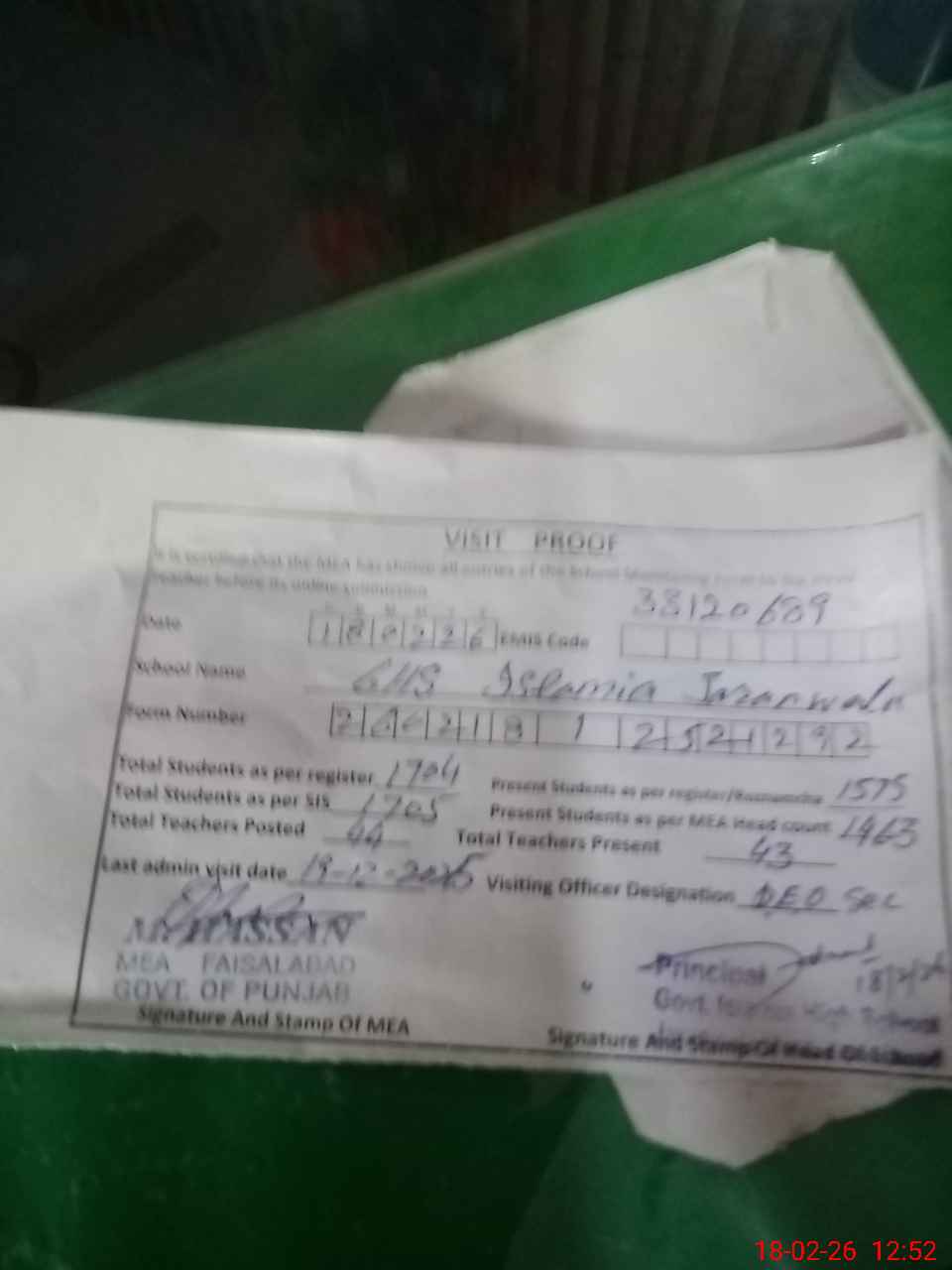 | EMIS Code: 33120689 | Name of School: GHS ISLAMIA JARANWALA-1 | |||