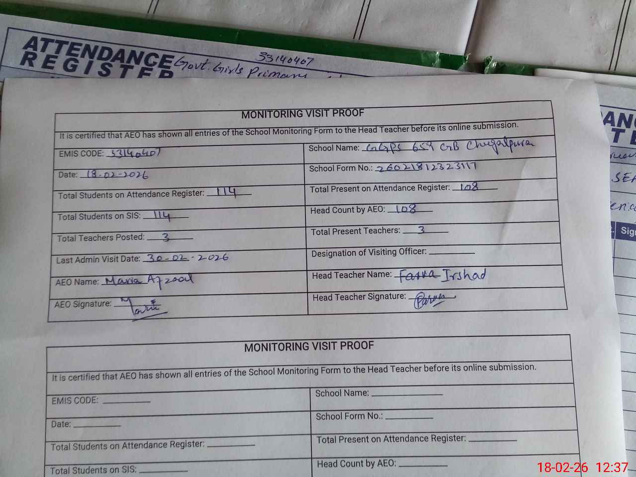 | Attendance Register | Head Teacher | MEA with School | Visit Proof |