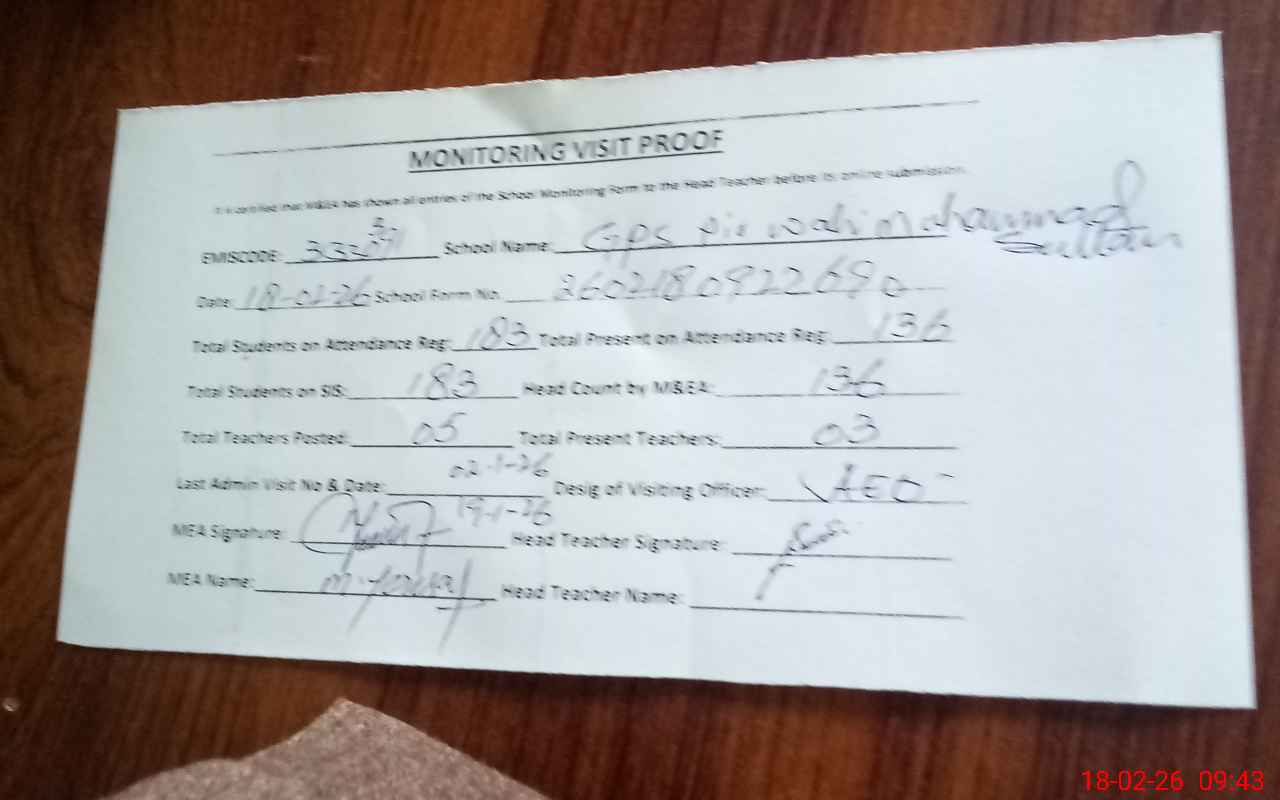 | EMIS Code: 31330391 | Name of School: GPS PIR WALI MUHAMMAD SULTAN | |||