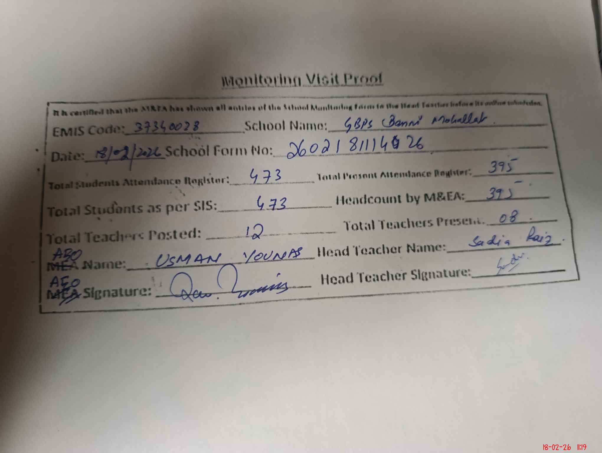 | EMIS Code: 37340028 | Name of School: GPS BANNI MOHALLAH | |||