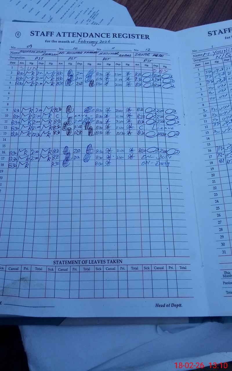 | CNIC | Full Name | Designation | R/C | Absence During Last Calender Month |