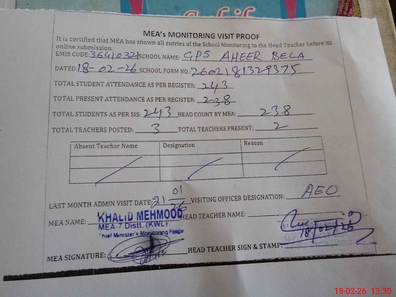 | Attendance Register | Head Teacher | MEA with School | Visit Proof |