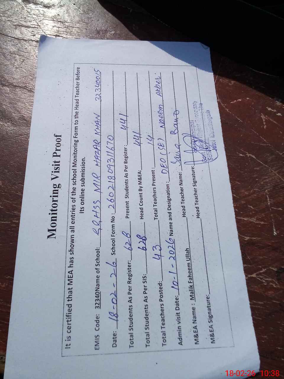 | Certified that this School was Inspected by the Undersigned MEA/DMO Today and the Information Stated Above is as Per Record. | |||||