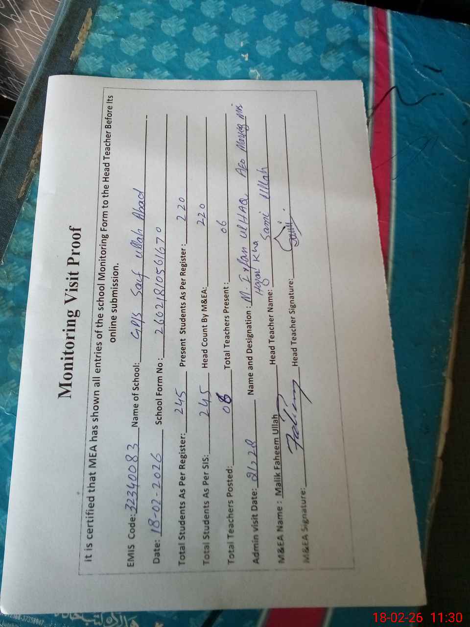| Attendance Register | Head Teacher | MEA with School | Visit Proof |