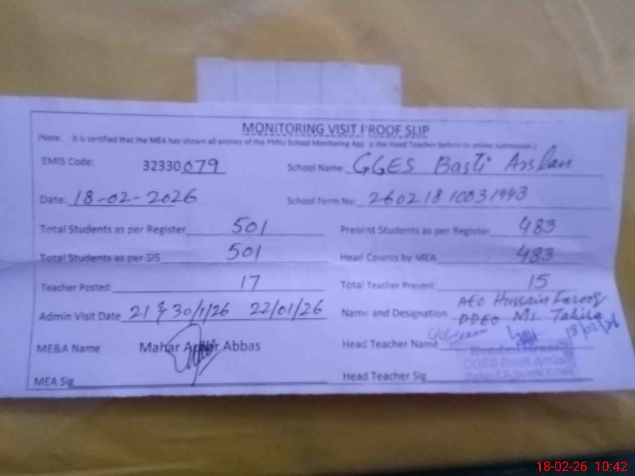 | Attendance Register | Head Teacher | MEA with School | Visit Proof |