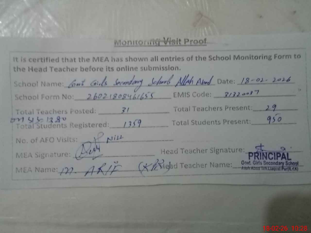 | EMIS Code: 31320037 | Name of School: GGHS ALLAH ABAD | |||