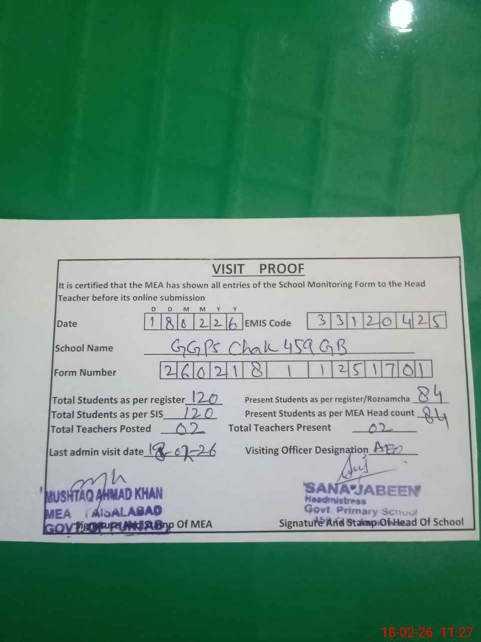 | EMIS Code: 33120425 | Name of School: GGPS CHAK 459 GB LUNDIANWALA | |||