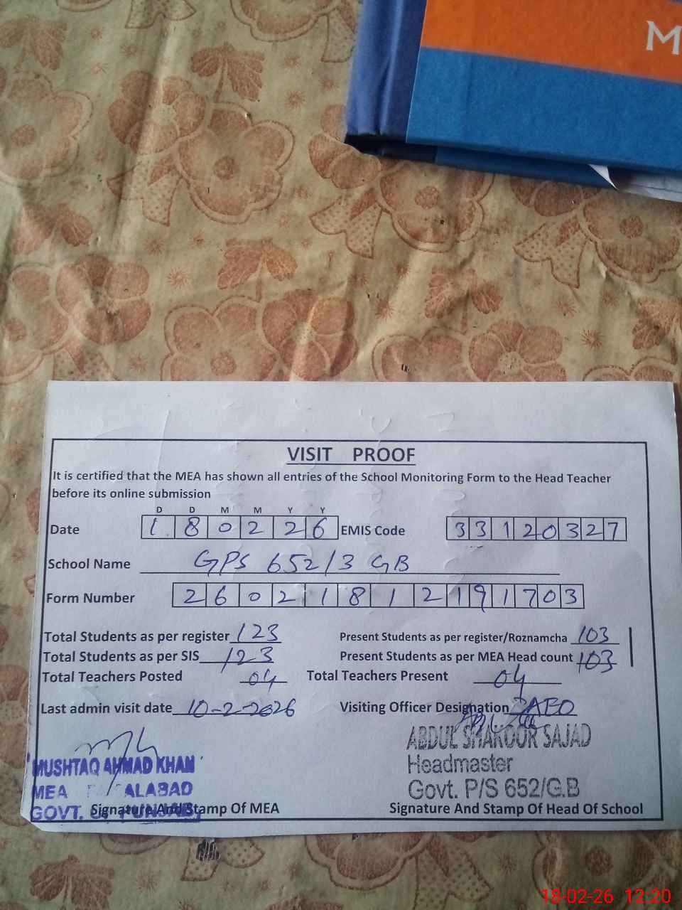 | Attendance Register | Head Teacher | MEA with School | Visit Proof |